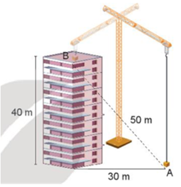 Một chiếc cần cẩu xây dựng cẩu một khối vật liệu nặng 500 kg từ vị trí A ở mặt đất đến vị trí B của một tòa nhà cao tầng với các thông số cho trên Hình 25.6. Lấy gia tốc trọng trường g = 9,8 m/s2 . Tính công mà cần cẩu đã thực hiện (kJ)