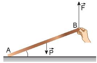 Một người dùng tay tác dụng lực F nâng vật là một thanh rắn đồng chất dài 1 m như hình dưới đây. Biết góc giữa thanh và sàn nhà là 300 và thanh rắn có trọng lượng 20 N. Độ lớn của lực F là