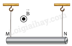 Treo đoạn dây dẫn MN có chiều dài 25 cm, khối lượng 10 g bằng hai dây mảnh, nhẹ sao cho dây dẫn MN nằm ngang cân bằng. Biết cảm ứng từ có chiều như hình vẽ và độ lớn 0,04 T. Lấy g = 10 m/s2.