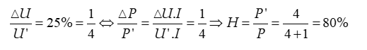Điện năng được truyền từ một trạm điện đến nơi tiêu thụ bằng đường dây tải điện một pha. Độ giảm điện áp hiệu dụng trên đường dây bằng 25% điện áp hiệu dụng nơi tiêu thụ. Hiệu suất của quá trình truyền tải điện năng này bằng bao nhiêu %?