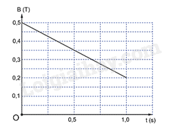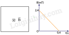 Một khung dây cứng, phẳng có diện tích 25 cm², gồm 10 vòng dây. Khung dây được đặt trong từ trường đều có các đường sức từ vuông góc với mặt phẳng khung dây như hình vẽ. Cảm ứng từ B của từ trường biến thiên theo thời gian t theo đồ thị hình bên.