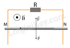 Thanh MN trượt xuống do tác dụng của trọng lực, lúc này từ thông tăng, xuất hiện dòng điện cảm ứng \({I_c}\). Sử dụng quy tắc bàn tay phải ta xác định được chiều dòng điện cảm ứng từ N đến M.