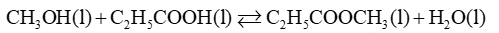 Câu 1: Methanol và propanoic acid phản ứng với nhau tạo thành methy propanoate theo phản ứng hóa học sau: \(C{H_3}OH(l) + {C_2}{H_5}COOH(l) \mathbin{\lower.3ex\hbox{$\buildrel\textstyle\rightarrow\over{\smash{\leftarrow}\vphantom{_{\vbox to.5ex{\vss}}}}$}} C{H_3}COO{C_2}{H_5}(l) + {H_2}O(l)\)