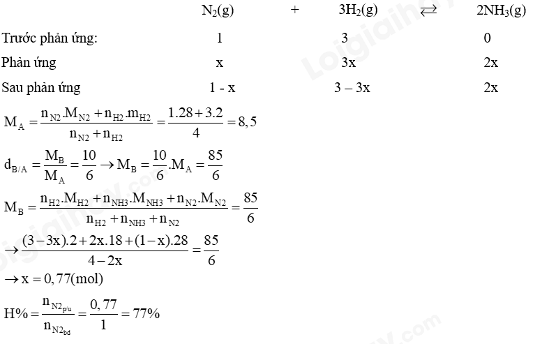 Câu 2: Hỗn hợp A gồm N2 và H2 theo tỷ lệ thể tích 1:3, tạo phản ứng giữa N2 và H2 sinh ra NH3. Sau phản ứng được hỗn hợp khí B có tỉ khối so với khí A là 10/6. Tính hiệu suất phản ứng trên?