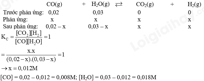 \(CO(g) + {H_2}O(g) \mathbin{\lower.3ex\hbox{$\buildrel\textstyle\rightarrow\over{\smash{\leftarrow}\vphantom{_{\vbox to.5ex{\vss}}}}$}} C{O_2}(g) + {H_2}(g)\)(hằng số cân bằng KC = 1). Tính nồng độ cân bằng của CO, H2O.