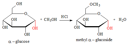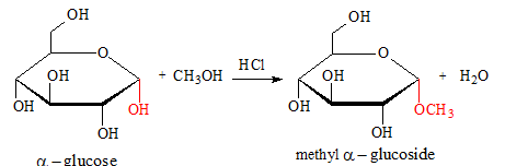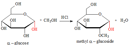 Ở dạng cấu tạo mạch vòng, nhóm -OH hemiacetal của glucose tác dụng với methanol khi có mặt của HCl khan, tạo thành methyl glucoside qua phản ứng nào sao đây ?