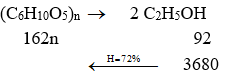m tinh bột = \(\frac{{3680.162}}{{92}}:72\% = 9000g = 9kg\)