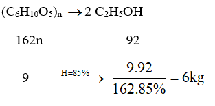 V C2H5OH nguyên chất = \(\frac{6}{{0,8}} = 7,5l\)