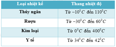 Câu 11: Bảng dưới đây ghi tên các loại nhiệt kế và nhiệt độ ghi trên thang đo của chúng. Phải dùng nhiệt kế nào để đo nhiệt độ của bàn là, cơ thể người, nước đang sôi, không khí trong phòng?