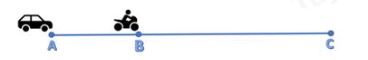 Giả sử: A là vị trí CSGT bắt đầu đuổi theo; B là vị trí của xe máy khi CSGT bắt đầu đuổi; C là vị trí CSGT đuổi kịp xe máy.