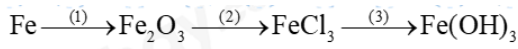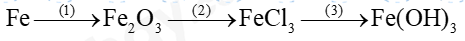 \(\begin{array}{l}(1)4Fe + 3{O_2} \to 2F{e_2}{O_3}\\(2)F{e_2}{O_3} + 6HCl \to 2FeC{l_3} + 3{H_2}O\\(3)FeC{l_3} + 3NaOH \to Fe{(OH)_3} + 3NaCl\end{array}\)