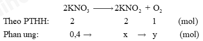 b) Số mol KNO2: \({\rm{x}}\,\,{\rm{ = }}\,\,\frac{{{\rm{0,4}}\,{\rm{.}}\,\,{\rm{2}}}}{{\rm{2}}}\,{\rm{ = }}\,\,{\rm{0,4}}\,\,{\rm{(mol)}}\,\); Số mol O2: \(y\, = \,\frac{{0,4\,{\rm{.}}\,\,1}}{2}\,\,{\rm{ = }}\,\,{\rm{0,2}}\,\,{\rm{(mol)}}\,.\)
