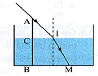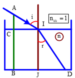 Một cây cọc dài được cắm thẳng đứng xuống một bể nước chiết suất \(n = \frac{4}{3}\). Phần cọc nhô ra ngoài mặt nước là 30 cm, bóng của nó trên mặt nước dài 40 cm và dưới đáy bể nước dài 190 cm. Tính chiều sâu của lớp nước