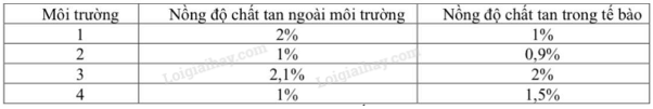 Câu 7: Giả thuyết các trường hợp môi trường của tế bào theo bảng sau: