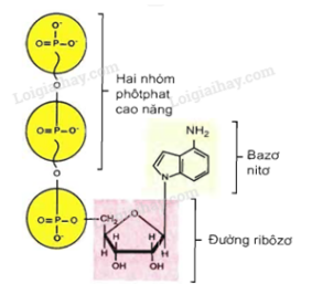 - ATP là một phân tử có cấu tạo gồm các thành phần : bazơ nitơ ađênin, đường ribôzơ và 3 nhóm photphat. Đây là một hợp chất cao năng vì liên kết ~) giữa 2 nhóm photphat cuối cùng trong ATP rất dễ bị phá vỡ để giải phóng ra năng lượng.