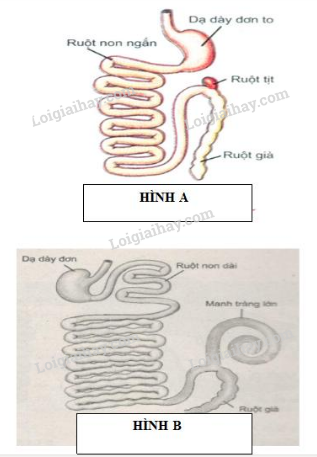Hãy quan sát vào hình ảnh A và hình ảnh B bên dưới và trả lời các câu hỏi: a. Hãy xác định hình nào là dạ dày và ruột của thú ăn thịt và hình nào là dạ dày và ruột của thú ăn thực vật. b. Hãy chỉ ra những căn cứ để xác định dạ dày và ruột của thú ăn thịt và thú ăn thực vật |