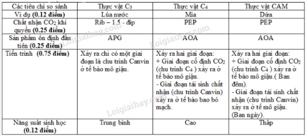 Câu 2 (2,0 điểm). Nêu sự giống nhau và khác nhau giữa các con đường C3, C4 và CAM.
