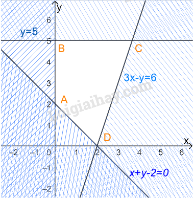 Miền nghiệm là miền tứ giác ABCD trong đó \(A\left( {0;2} \right),{\rm{ }}B\left( {0;5} \right),{\rm{ }}C\left( {\frac{{11}}{3};5} \right),D(2;0)\)