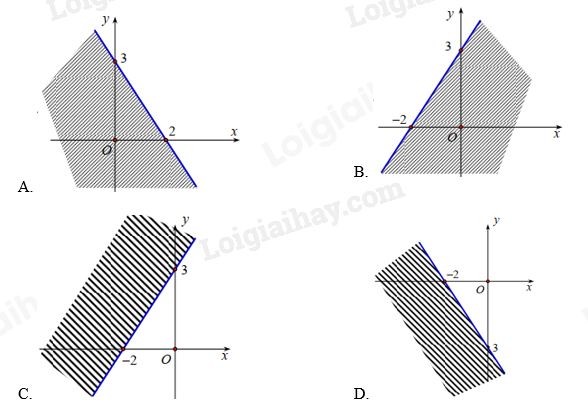 Nhận thấy, điểm O (0; 0) không thuộc đường thẳng \(d:3x - 2y + 6 = 0\) và \(3.0 - 2.0 + 6 > 0\) nên miền nghiệm của phương trình \(3x - 2y + 6 < 0\) là nửa mặt phẳng bờ là đường thẳng d (không tính bờ) không chứa điểm O.