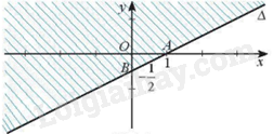 Ta thấy điểm O (0; 0) không thuộc đường thẳng \(\Delta \), \(0 - 2.0 - 1 < 0\) và điểm O không thuộc miền nghiệm của bất phương trình nên bất phương trình cần tìm là \(x - 2y - 1 > 0\).