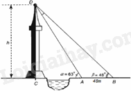 Tam giác CDA vuông tại C nên \(DC = AD.\sin \alpha \Rightarrow h = \frac{{48.\sin {{48}^0}}}{{\sin {{15}^0}}}.\sin {63^0} \approx 122,8\left( m \right)\)