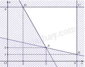 Miền nghiệm của hệ bất phương trình là tứ giác ABCD (kể cả biên) với A (5;2), B (9;1), C (9;8); D (2; 8) như hình vẽ: