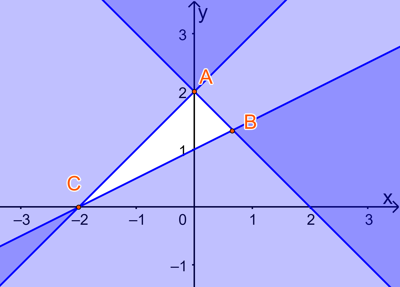 A. \(\left\{ \begin{array}{l}x + y - 2 \le 0\\x - y + 2 \ge 0\\x - 2y + 2 \le 0\end{array} \right.\) B. \(\left\{ \begin{array}{l}x + y - 2 \ge 0\\x - y + 2 \ge 0\\x - 2y + 2 \le 0\end{array} \right.\)