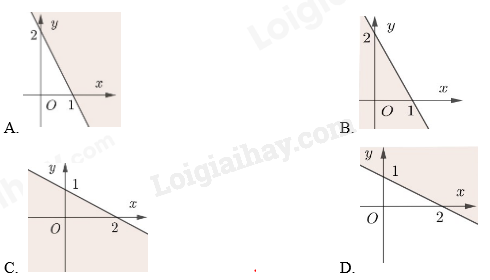 Ta thấy điểm O (0; 0) không thuộc đường thẳng \(d:2x + y - 2 = 0\) và \(2.0 + 0 < 2\) nên miền nghiệm của bất phương trình \(2x + y > 2\) là nửa mặt phẳng (không kể bờ d) không chứa điểm O.