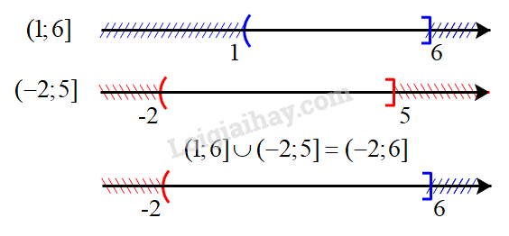 Hợp của hai tập hợp: \((1;6] \cup ( - 2;5] = ( - 2;6]\)