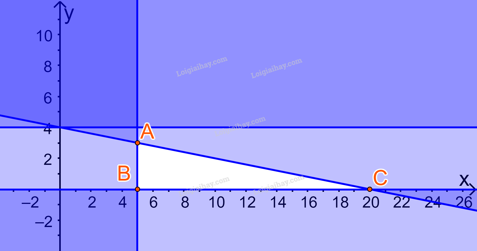 Miền nghiệm là miền tam giác ABC (kể cả các cạnh), trong đó \(A(5;3),B(5;0),C(20;0)\)