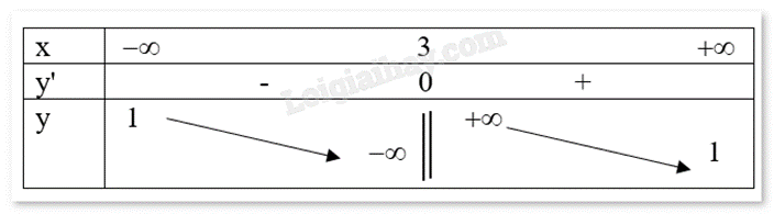 Quan sát bảng biến thiên thấy \(\mathop {\lim }\limits_{x \to {3^ + }} y = + \infty ,\mathop {\lim }\limits_{x \to {3^ - }} y = - \infty \) nên tiệm cận đứng của đồ thị là x = 3, ta loại đáp án B và C.