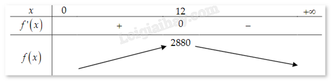 Ta có: \(f'(x) = 480 - 40x = 0 \Leftrightarrow x = 12.\)