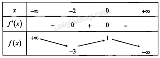 \(\left\{ {\begin{array}{*{20}{c}}{f'(0) = 0}\\{f(0) = 1}\\{f'( - 2) = 0}\\{f( - 2) = - 3}\end{array}} \right. \Leftrightarrow \left\{ {\begin{array}{*{20}{c}}{c = 0}\\{d = 1}\\{12a - 4b = 0}\\{ - 8a + 4b + 1 = - 3}\end{array}} \right. \Leftrightarrow \left\{ {\begin{array}{*{20}{c}}{c = 0}\\{d = 1}\\{a = - 1}\\{b = - 3}\end{array}} \right.\)