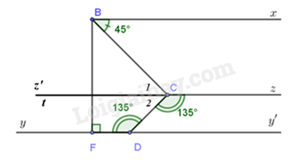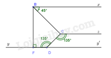 Vì \(\widehat {yDC} + \widehat {CDy'} = 180^\circ \) (hai góc kề bù) nên \(\widehat {CDy'} = 180^\circ - \widehat {yDC} = 180^\circ - 135^\circ = 45^\circ \) (2).