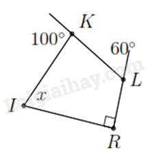 Ta có tổng các góc trong tứ giác là \(360^\circ \) nên \(\widehat {IKL} + \widehat {KLR} + \widehat {R\,} + \widehat {I\,} = 360^\circ \)