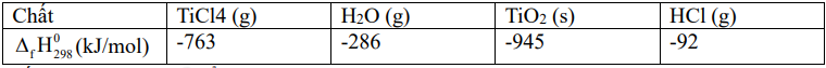 \({\Delta _r}H_{298}^0\)= \({\Delta _f}H_{298}^0(Ti{O_2}) + 4.{\Delta _f}H_{298}^0(HCl) - {\Delta _f}H_{298}^0(TiC{l_4}) - 2{\Delta _f}H_{298}^0({H_2}{\rm{O}})\)