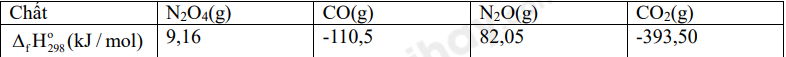 \(\begin{array}{l}{\Delta _r}H_{298}^o = {\Delta _f}H_{298}^o({N_2}{\rm{O) + 3}}{\Delta _{\rm{f}}}{\rm{H}}_{298}^o(C{O_2}) - 3{\Delta _f}H_{298}^o(CO) - {\Delta _f}H_{298}^o({N_2}{{\rm{O}}_4})\\ = 82,05 + 3.( - 393,5) - 3.( - 110,5) - 9,16 = - 776,11kJ\end{array}\)