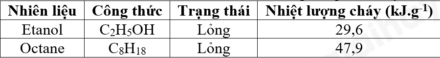 Xăng sinh học E10 là nhiên liệu hỗn hợp giữa (10% ethanol và 90% octane) về khối lượng, còn có tên là gasohol. Hiện nay có khoảng 40 nước trên thế giới đang sử dụng nhiên liệu này trong các động cơ đốt trong của xe hơi và phương tiện giao thông tải trọng nhẹ. Biết rằng nhiệt lượng cháy của nhiên liệu đo ở điều kiện tiêu chuẩn (25 oC, 100 kPa) được đưa trong bảng dưới đây: