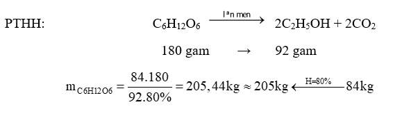 \({V_{C2H5{\rm{O}}H}} = \frac{{150.70}}{{100}} = 105l \to {m_{C2H5{\rm{O}}H}} = D.V = 0,8.105 = 84kg\)