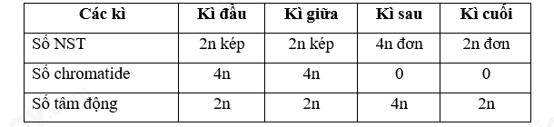 Sự biến đổi số lượng NST, cromatit, tâm động ở các kì như sau: