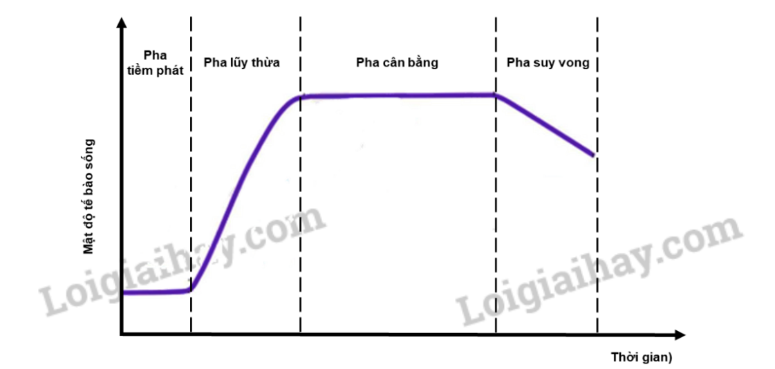 - Ở pha suy vong, đường cong sinh trường giảm xuống do dinh dưỡng cạn kiệt đồng thời các chất độc hại cho sự sinh trưởng của quần thể được tích lũy nên số lượng tế bào chết đi lớn hơn số lượng tế bào sinh ra làm mật độ tế bào suy giảm.