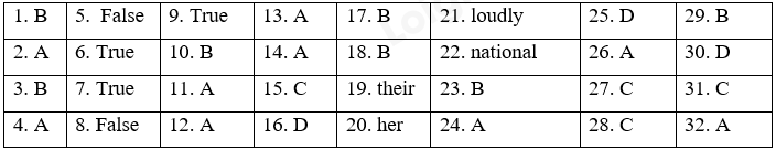 I. Choose the word which has the underlined part pronounced differently from the rest. II. Listen and decide whether the statement is True or False. III. Choose the best answer. IV. Fill in the blank with the right possessive adjectives. V. Give the correct form of the word given. VI. Read the passage carefully and choose the correct answer. VII. Read the passage and choose the best answer to fill in the blank. VIII. Rearrange the words to make complete sentences. IX. Make questions for the un