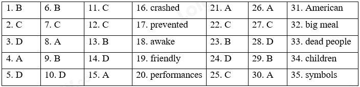 Một số lượng lớn người coi Halloween là một ngày lễ (31) của Mỹ. Trên thực tế, nó bắt nguồn từ người Celt ở Ireland. Ngày nay, mọi người không làm những gì người Celts cũ đã làm trong quá khứ. Họ không có một (32) bữa ăn thịnh soạn trước khi mùa đông bắt đầu và không để nhà của họ lạnh lẽo, không thắp đèn trong đêm, với hy vọng ngăn cản những linh hồn muốn sống ở đó. Người ta tin rằng linh hồn của (33) những người đã chết có thể quay trở lại nếu họ tìm thấy một người ở lại. Vì vậy, đeo những chiếc mặt nạ và trang phục đáng sợ để xua đuổi linh hồn là một truyền thống lâu đời của người Celtic.