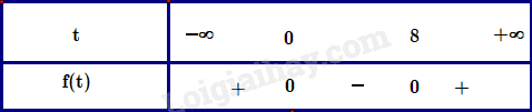 Ta có: \(f(t) \ge 0 \Leftrightarrow \left[ {\begin{array}{*{20}{l}}{t \le 0{\rm{ (}}l{\rm{) }}}\\{t \ge 8}\end{array}} \right.\).