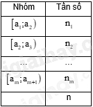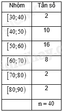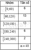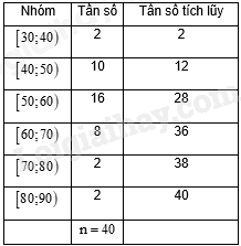 Ta có: \(\frac{{3n}}{4} = 30\) mà \(28 < 30 < 36\) nên nhóm 4 là nhóm đầu tiên có tần số tích lũy lớn hơn hoặc bằng 30.