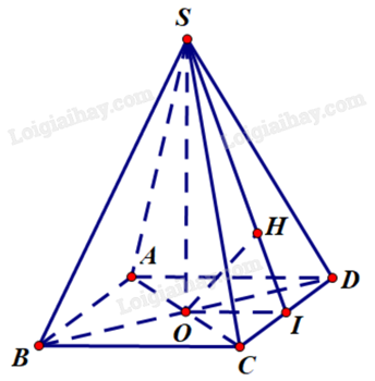 Ta có \(\left\{ \begin{array}{l}CD \bot OI\\CD \bot SO\end{array} \right. \Rightarrow CD \bot (SOI) \Rightarrow CD \bot OH\).