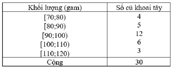 Khảo sát khối lượng 30 củ khoai tây ngẫu nhiên thu hoạch được ở một nông trường: