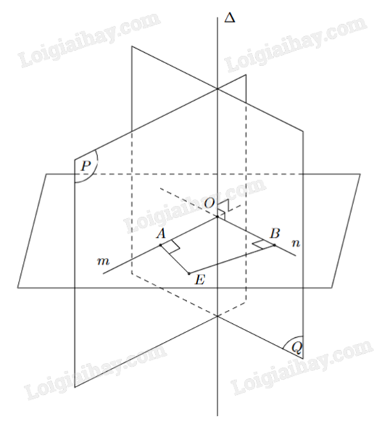 Cho hai mặt phẳng (P) và (Q) cắt nhau theo giao tuyến \(\Delta \) như hình vẽ. Lấy một điểm O bất kì thuộc đường thẳng \(\Delta \). Gọi m, n là các đường thẳng đi qua O, tương ứng thuôc (P), (Q) và vuông góc với \(\Delta \).