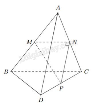 Cho tam giác MNP vuông tại N và một điểm A nằm ngoài mặt phẳng (MNP)). Lần lượt lấy các điểm B, C, D sao cho M, N, P tương ứng là trung điểm của AB, AC, CD (hình vẽ). Tính góc giữa hai đường thẳng AD và BC.