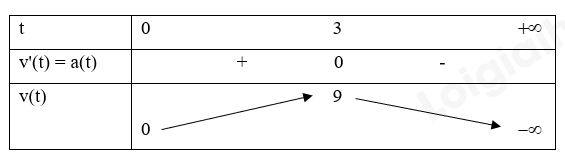 Xét hàm \(v(t) = 6t - {t^2}\), ta có \(v'(t) = a(t) = 6 - 2t = 0 \Leftrightarrow t = 3\).